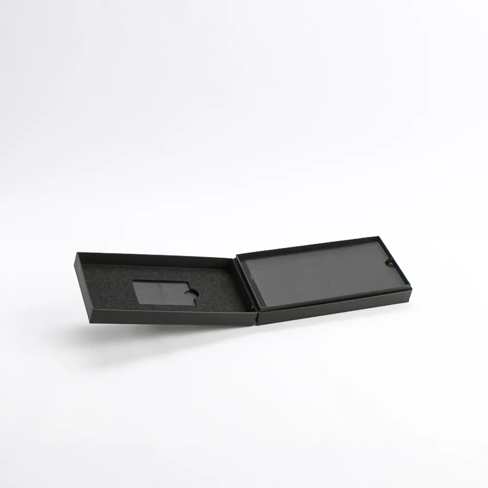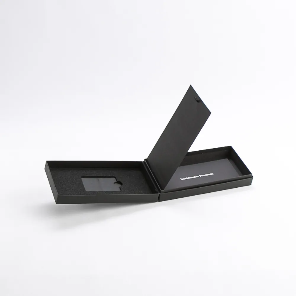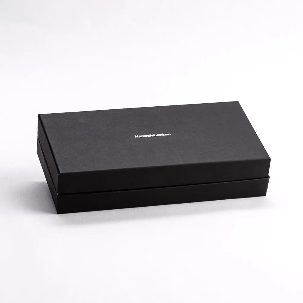 Pro kartu Infinite společnosti Handelsbanken vyrábíme černou krabičku na krk na míru s vnitřním prostorem a vodováhou. Karta je umístěna vlevo v buňkovité plastové vložce a pod přepážkou vpravo je umístěna související tiskovina. Na víku je vyražena stříbrná fólie s logem.