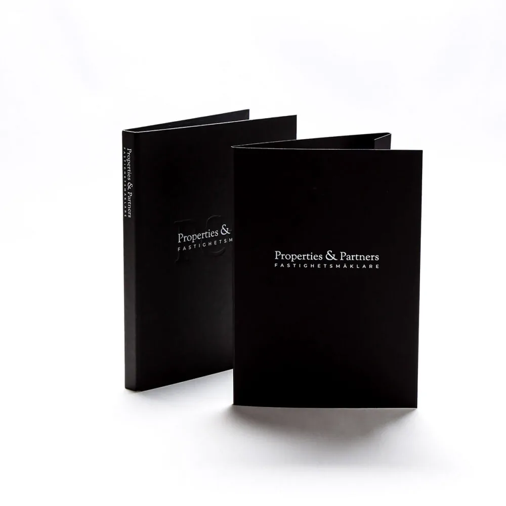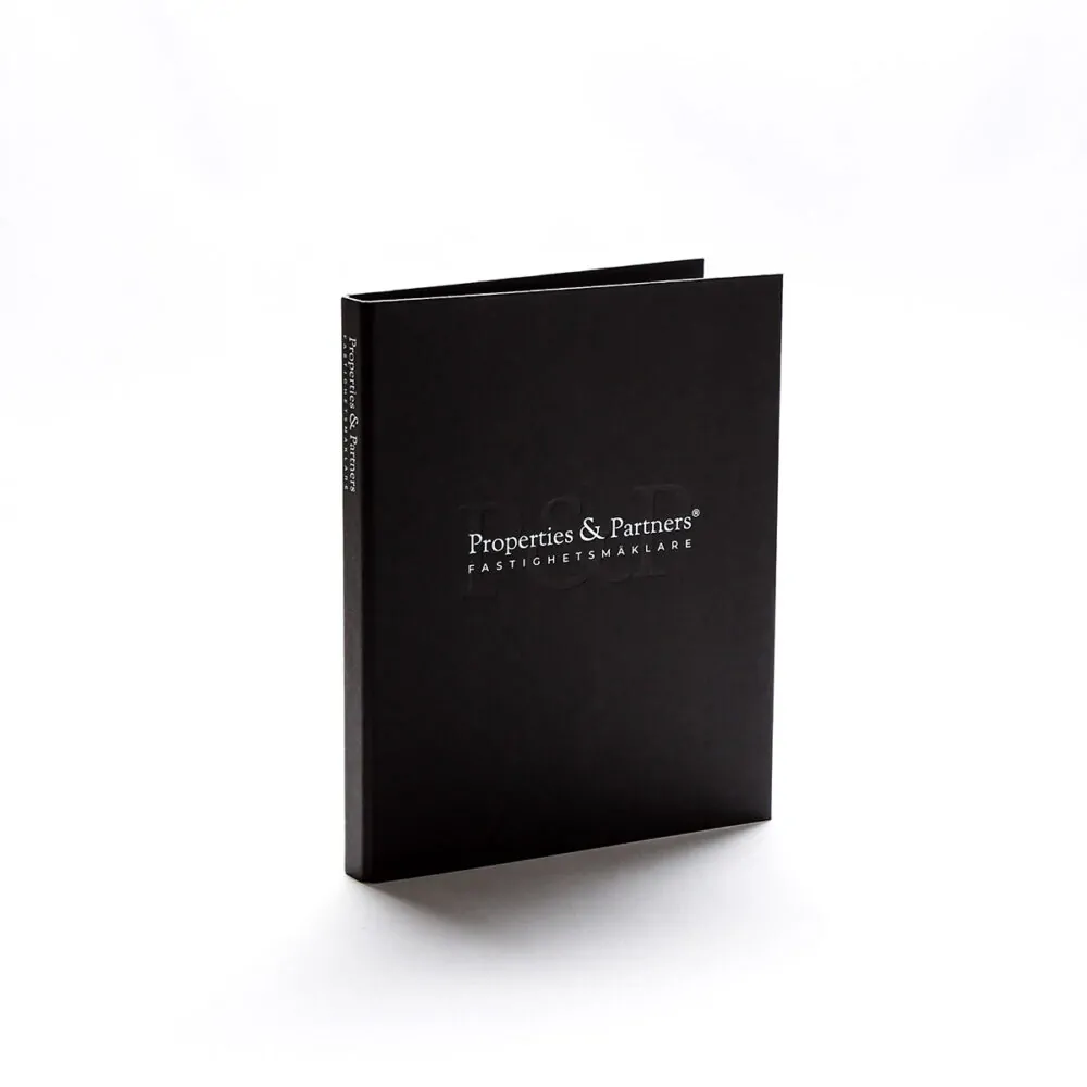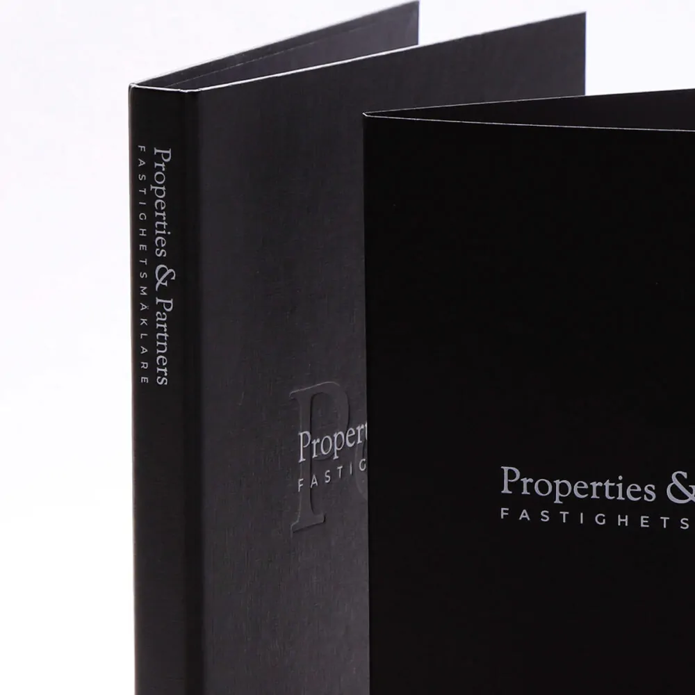 Pro realitní kancelář ESNY jsme vyrobili pořadač na smlouvy z šedé látky se stříbrnou ražbou a černý rejstřík z designového papíru. Doprovodný kartonový rejstřík je potištěn sítotiskem. Přenosná taška je vyrobena ve stejné velikosti a barvě, rovněž se stříbrnou ražbou fólií. Uchycení pro rukojeti je ukryto pod přehybem.