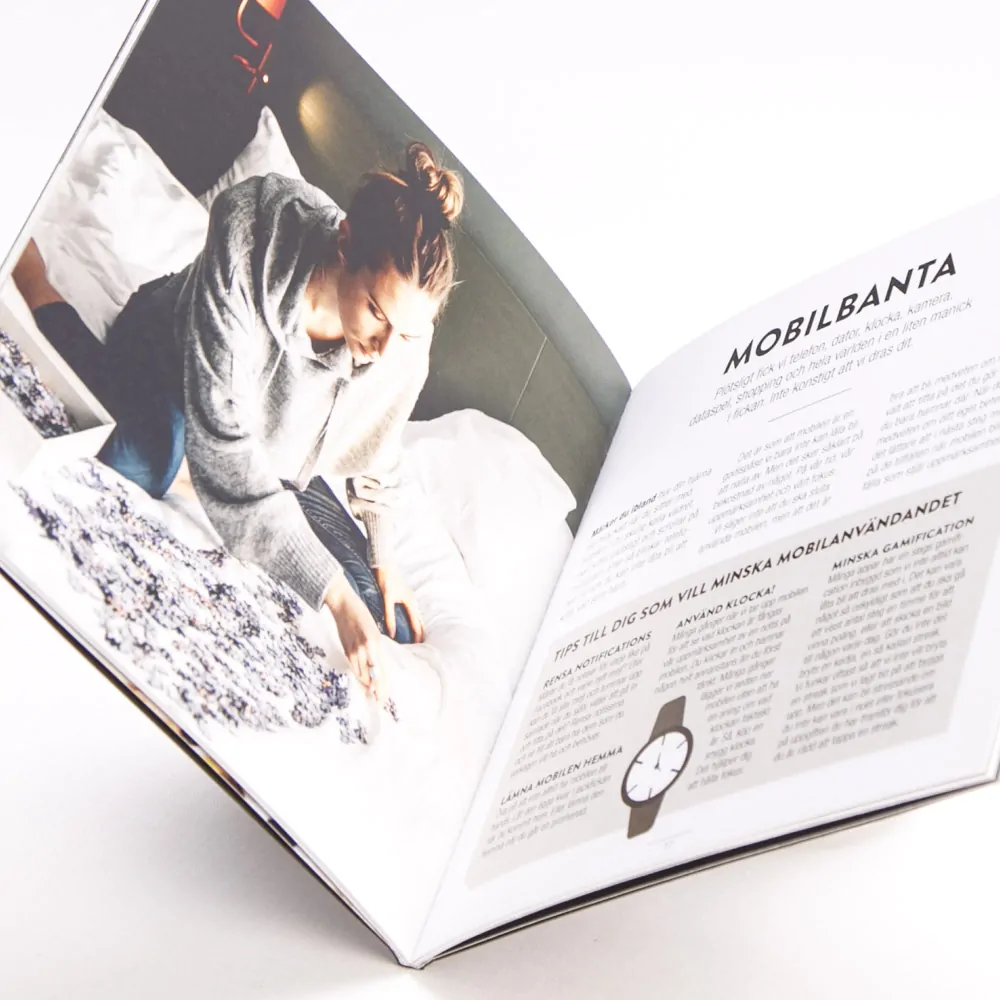 Když hotely Scandic zavedly ve svých hotelech 32hodinovou pracovní dobu, vydali jsme o tom knihu v lepené vazbě. Kniha má měkkou obálku z hnědého flocku s grafikou vyraženou fólií.