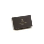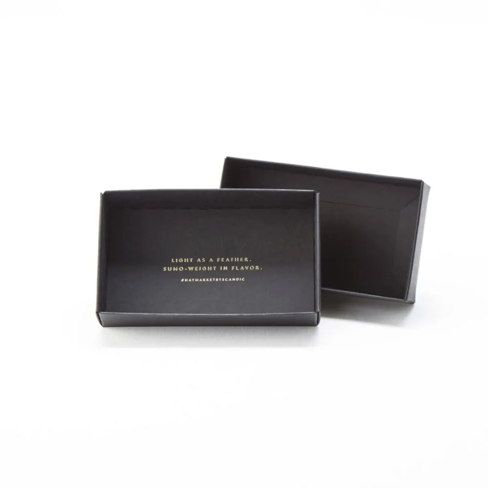 Jednoduchá, ale exkluzivní krabička na makronky z černého kartonu se zlatým fóliovým logem.