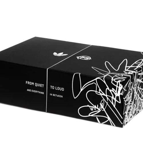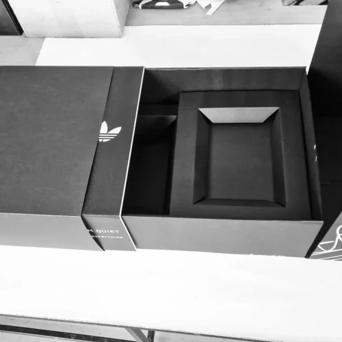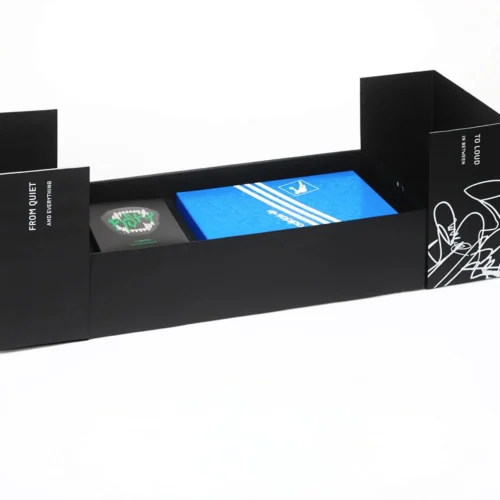 Krabice z vlnité lepenky děrovaná z jednoho kusu a složená do výklopné krabice s otvorem pro oltářní skříňku. Černá probarvená jamka s bílým sítotiskem. Výrobek se dále skládá z vnitřního a krycího pouzdra z černé barevné lepenky, rovněž potištěné bílým sítotiskem.