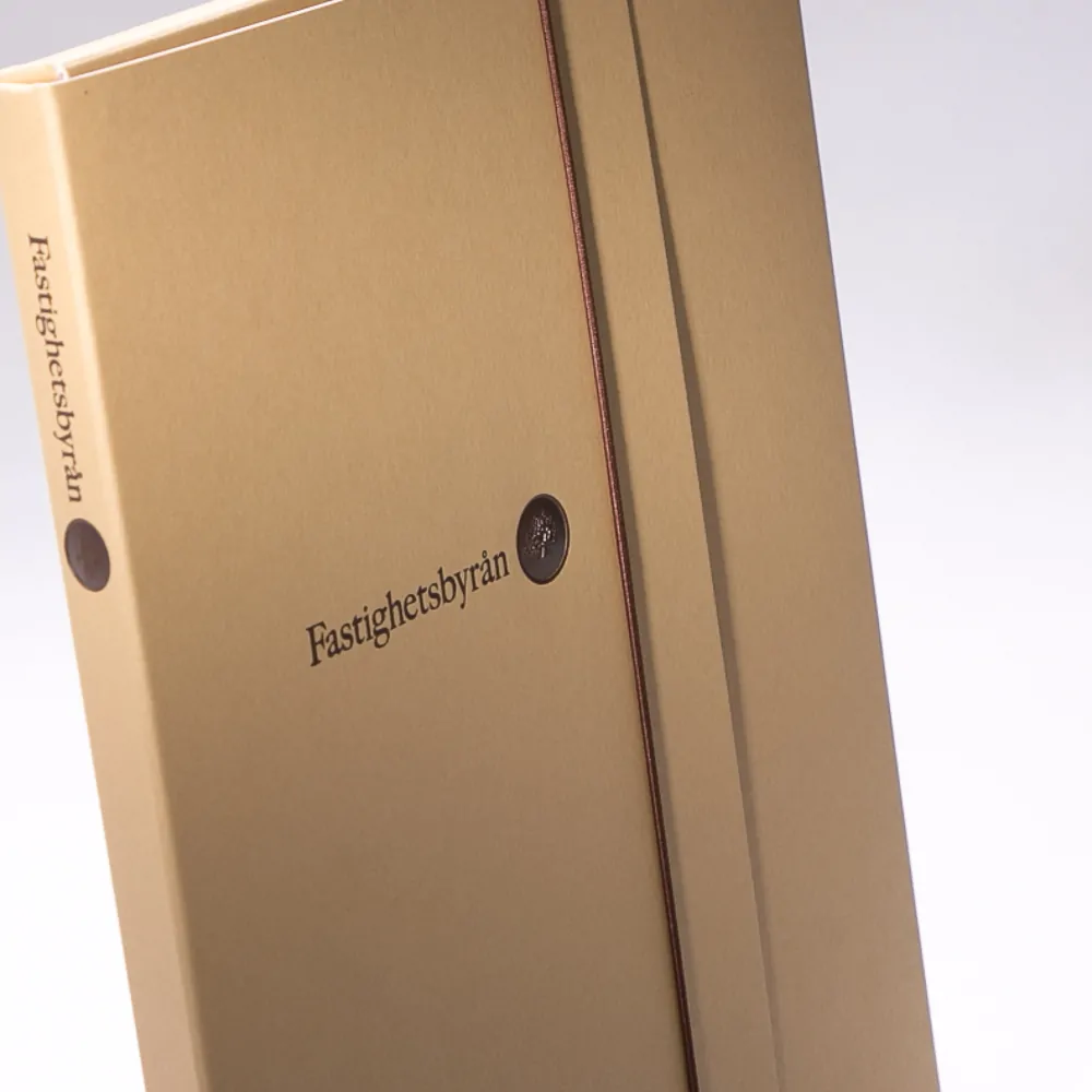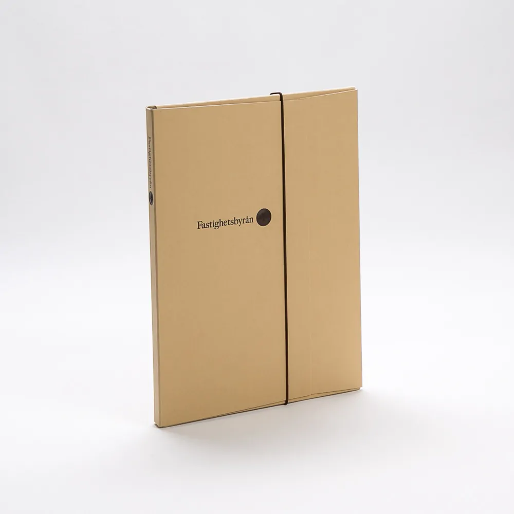 Pro Fastighetsbyån jsme vytvořili složku s podšívkou. Složka je zvenku i zevnitř potažena barevným designovým papírem, na kterém je logo vyraženo fólií s 3D efektem. Výsek pro konstrukci s elastickou šňůrkou pro uzavření.