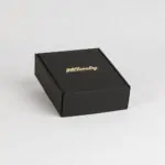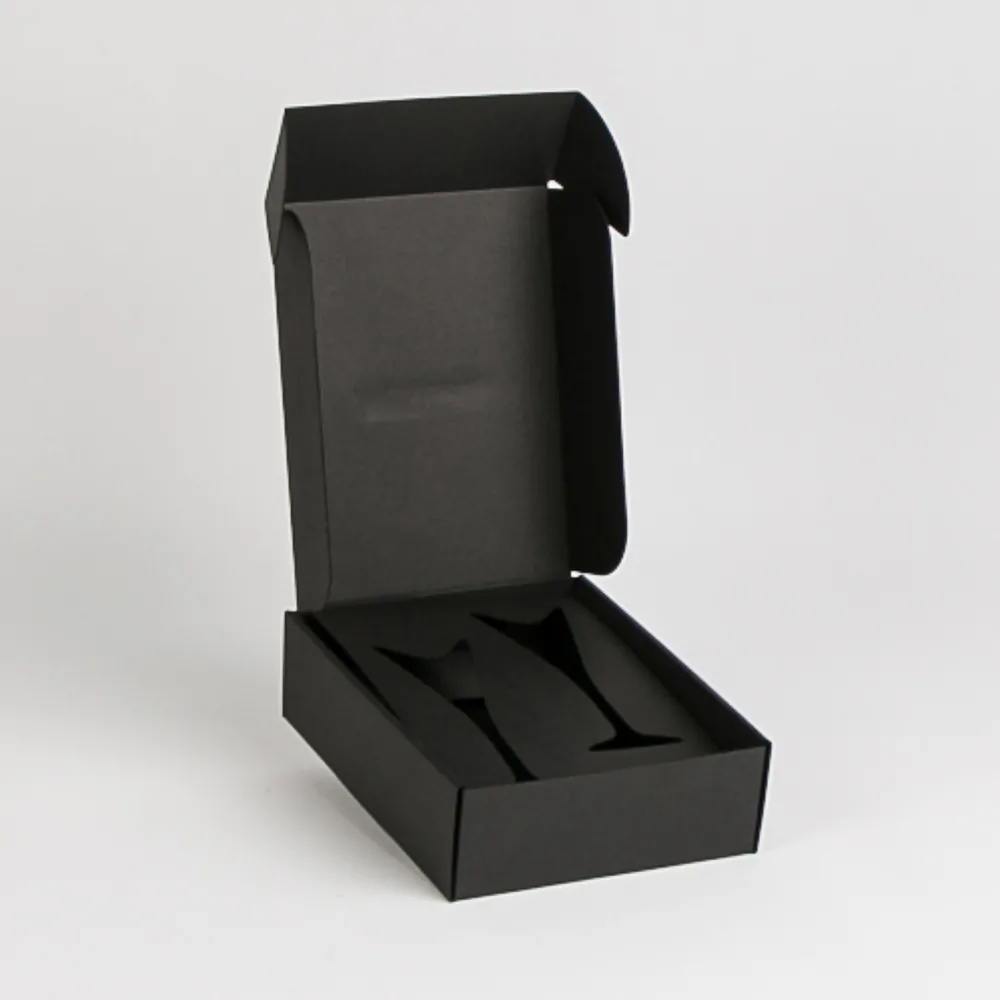 Pro Windy jsme vyrobili dárkovou krabici s vnitřním prostorem pro dvě sklenice z barevné černé vlnité lepenky. Na víko jsme zlatou fólií vyrazili logo.