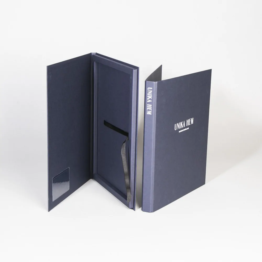 Pro realitní kancelář Unika Hem jsme vyrobili pořadač pro realitní kancelář a krabičku pro realitní kancelář z papíru s odpovídajícím designem. Krabice je vyrobena z designového kartonu ve stejné barvě a uvnitř je upevněn extra dlouhý zvedací popruh. Logo je vyraženo bílou fólií.