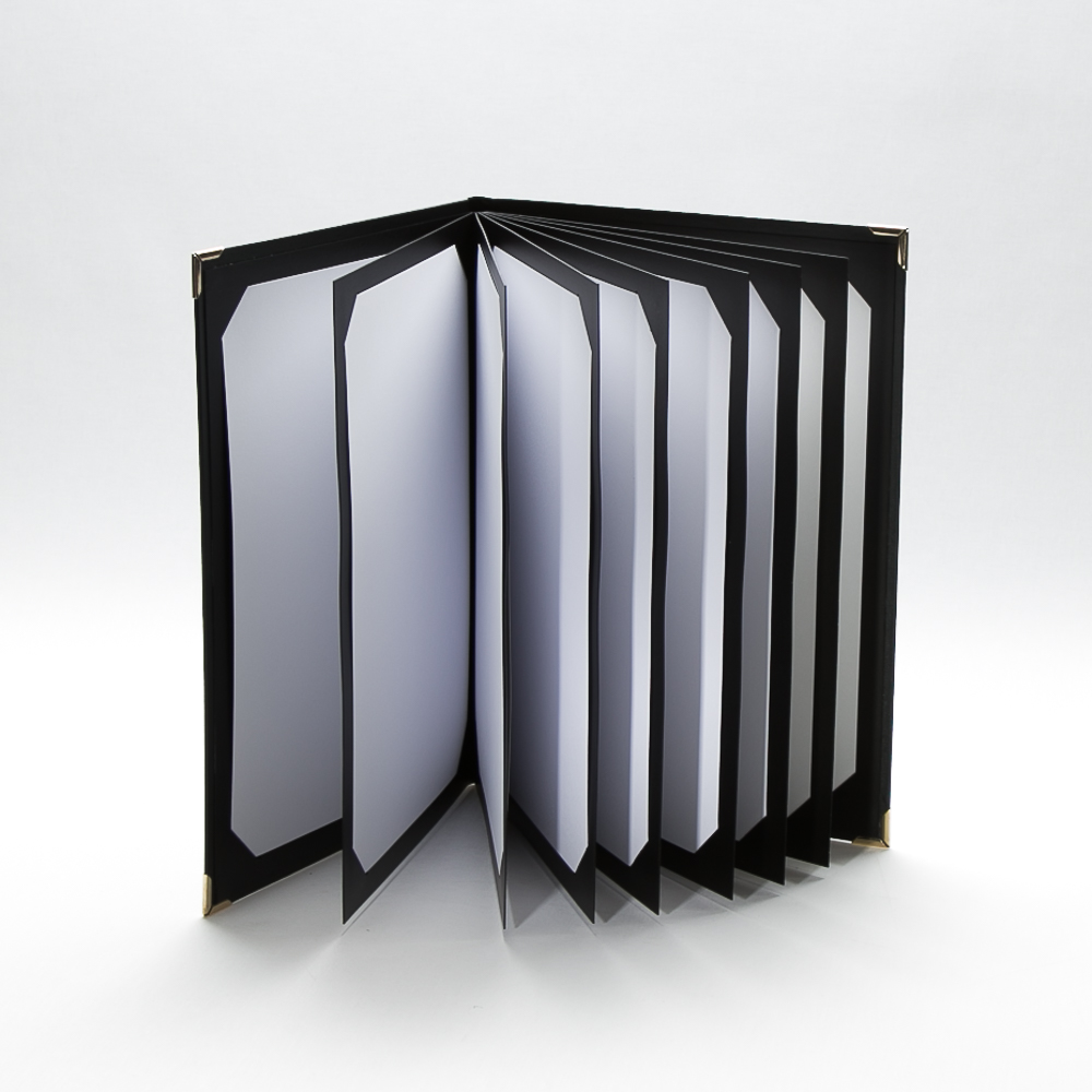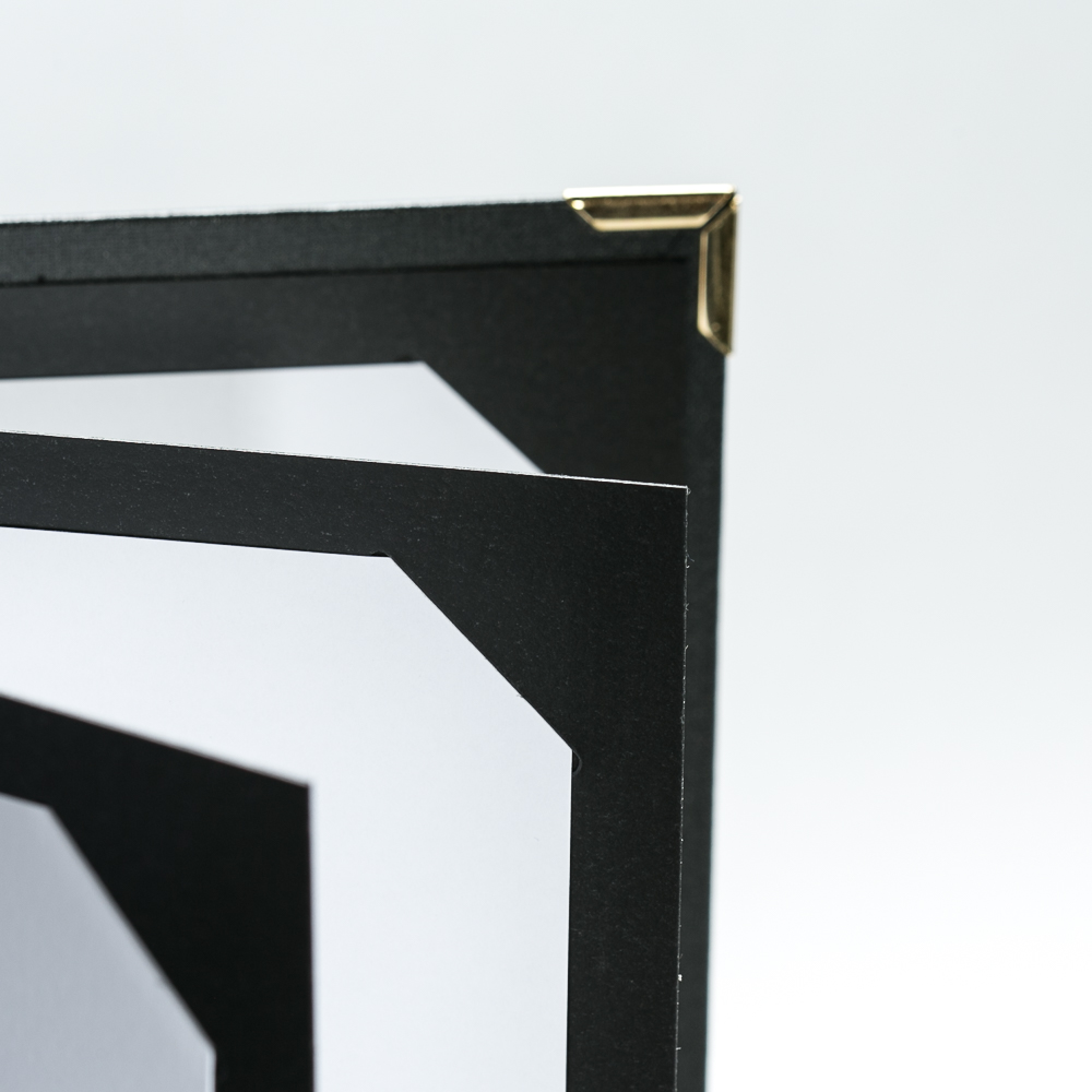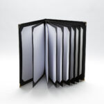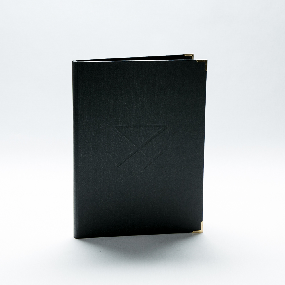 Pro hotel a hostinec Åkerblad jsme vyrobili jídelní lístky na míru z odolné bucramové tkaniny s oboustrannými rohy pro upevnění volných listů. Slepě vyražené logo na přední straně a kovové rohy.