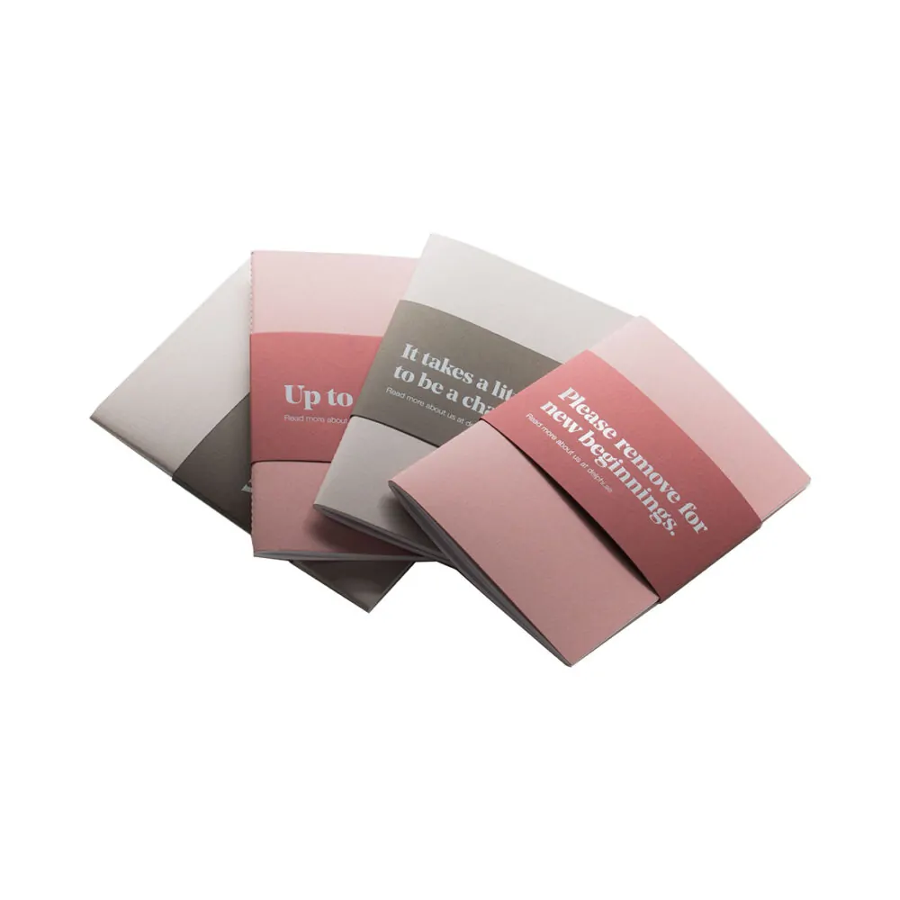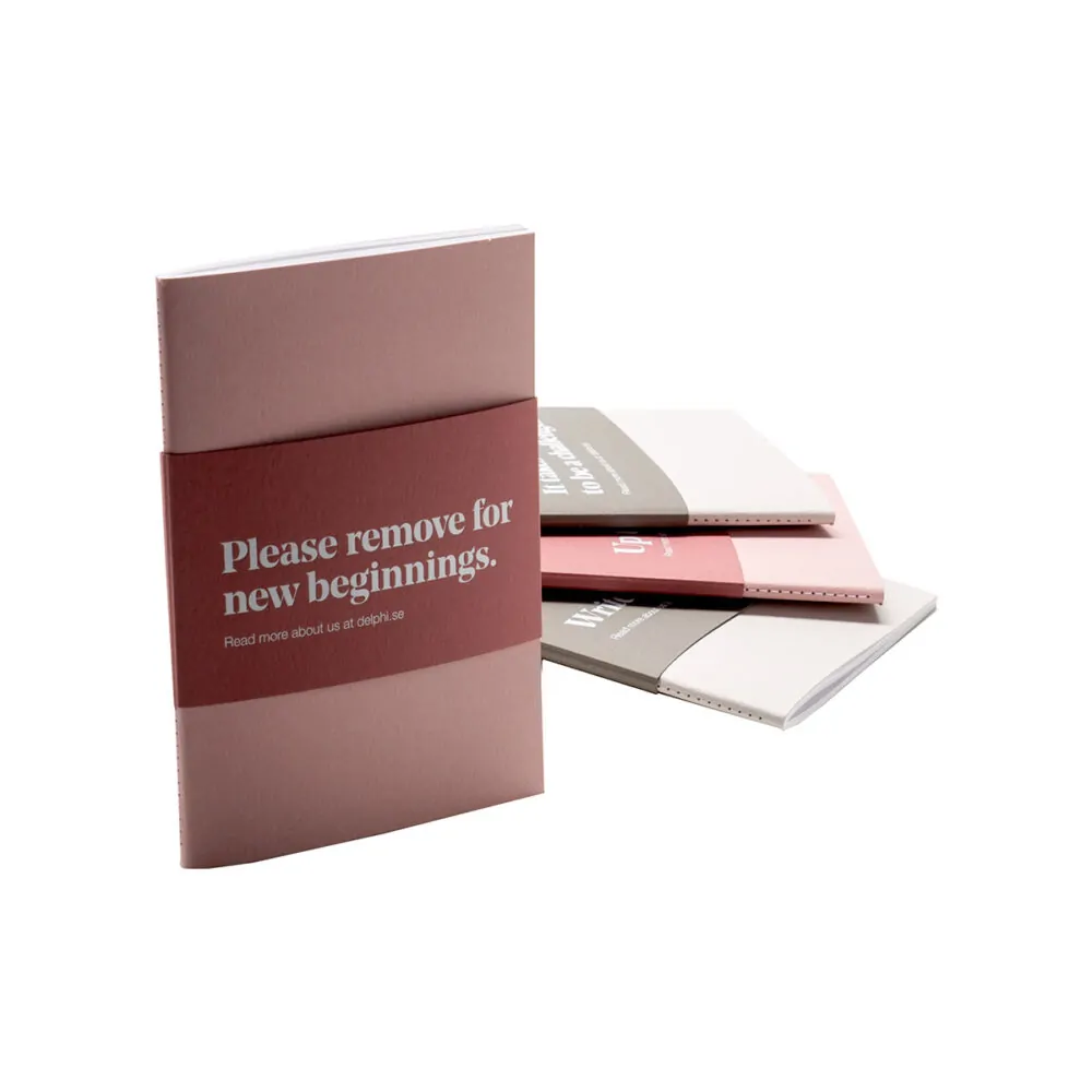 Cover in designer cardboard with foiled logoInlay bound with spine seamEditionally unique banner with foiled message
