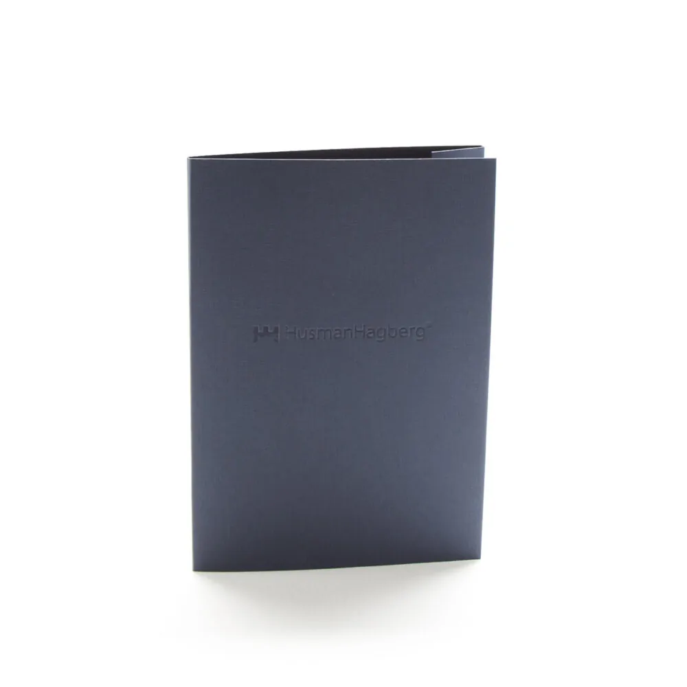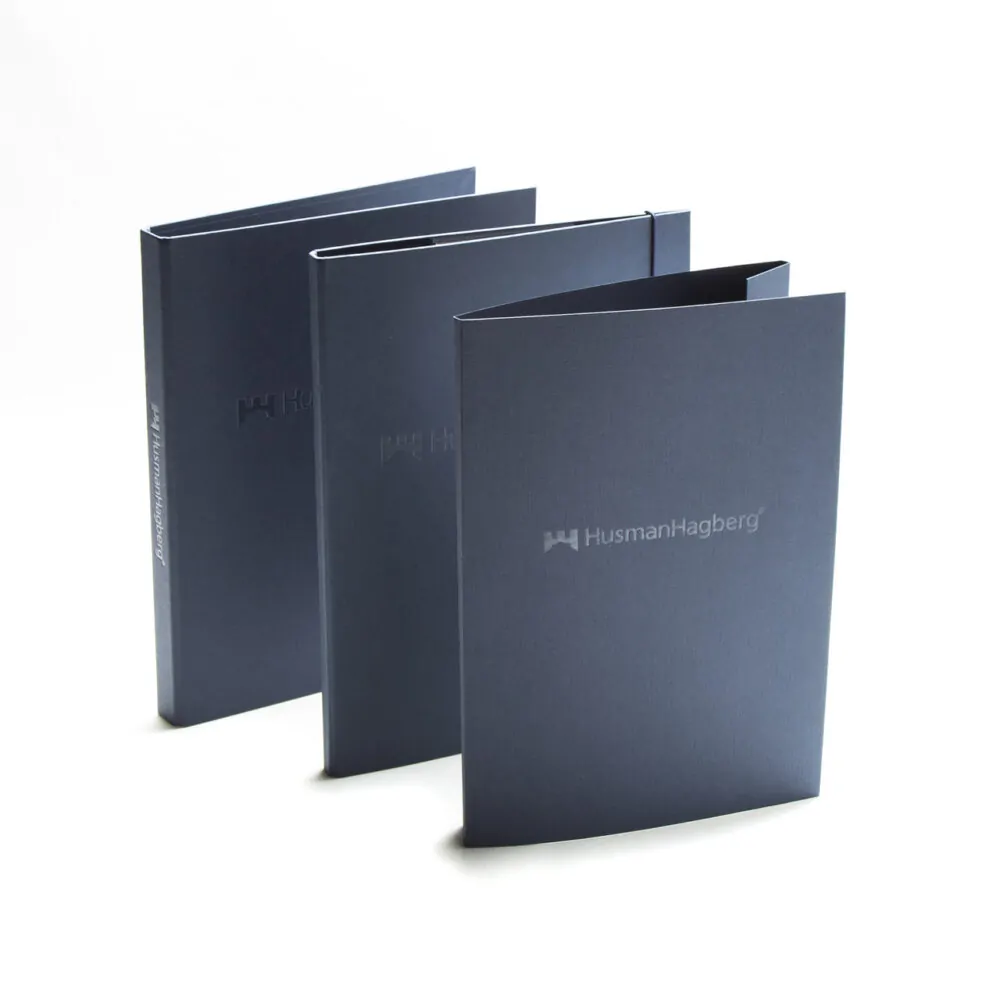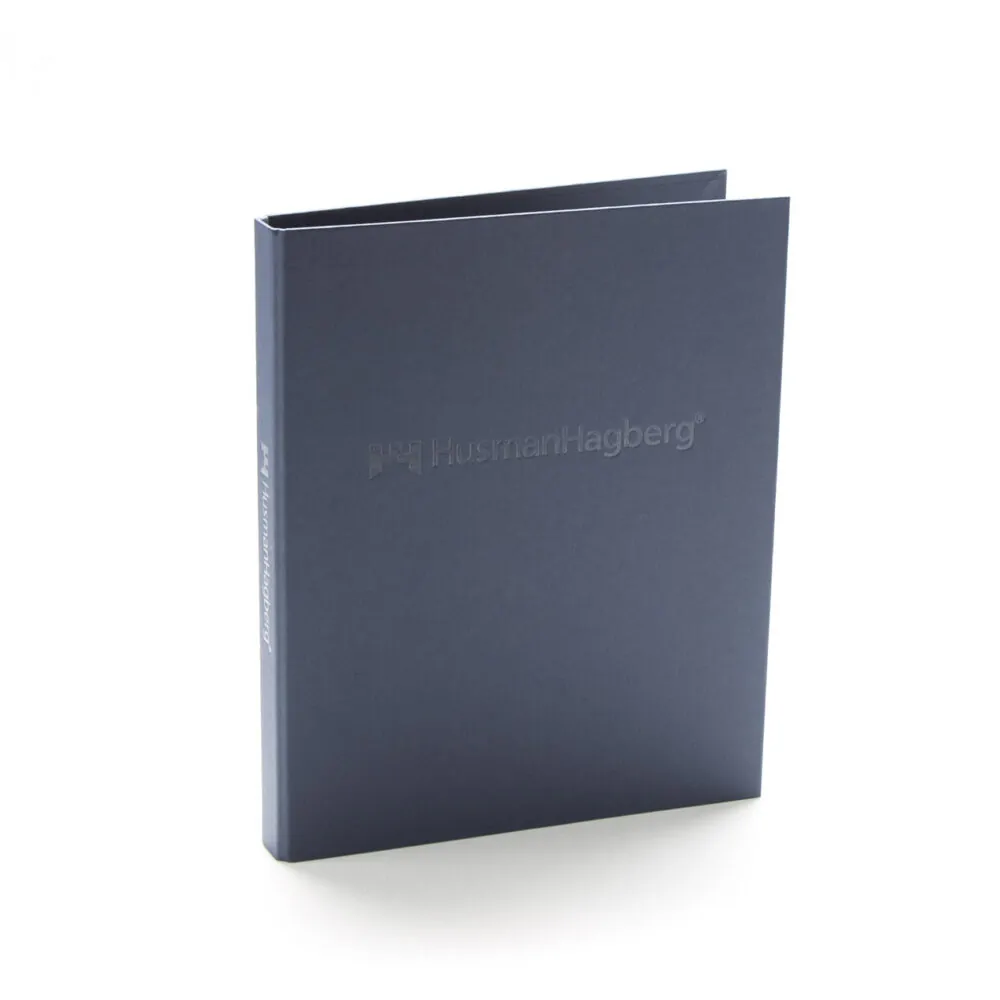 Contract binder and intake folder for Husman Hagberg. Covered with a coloured design paper and foil stamped logo.