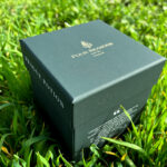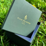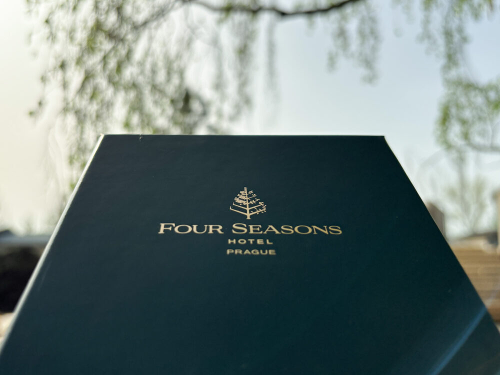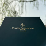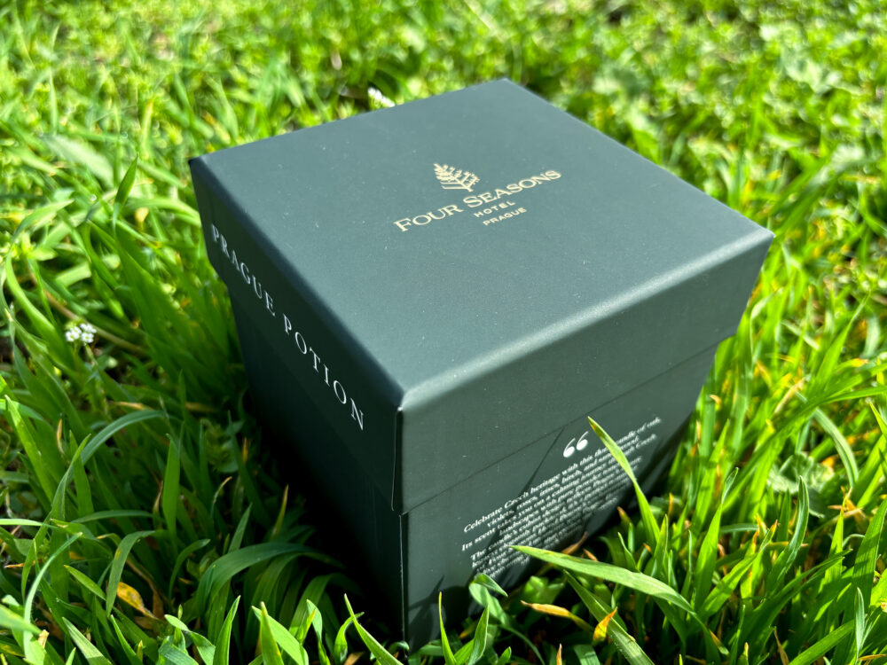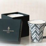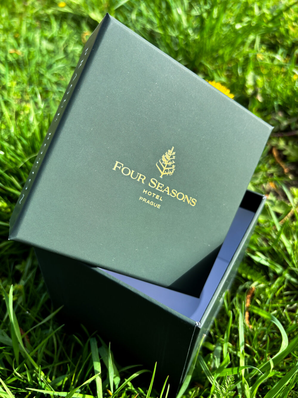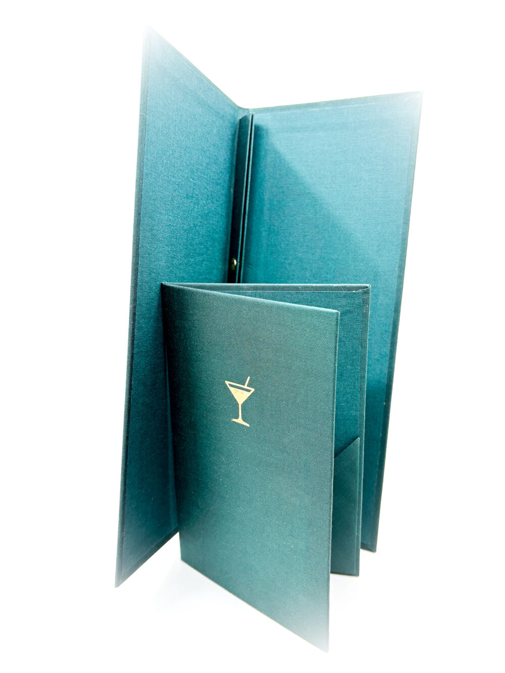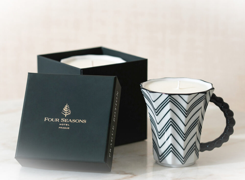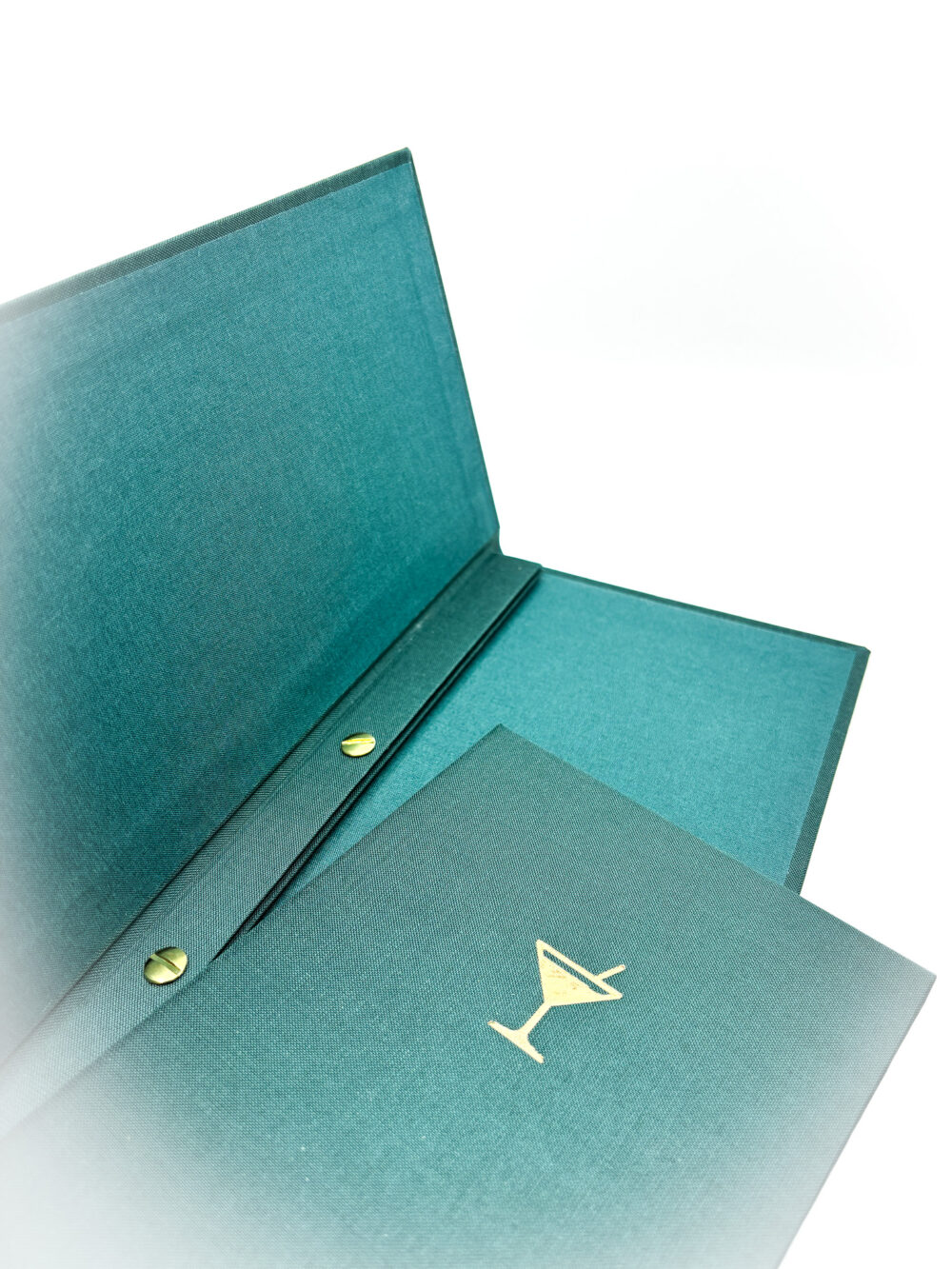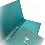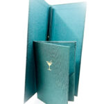 Box and lid containing scented candles. Four-colour printed and laminated cover with foiled lid. Menus are covered in fabric and foil stamped in gold