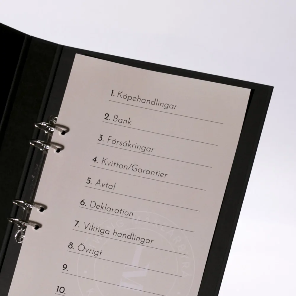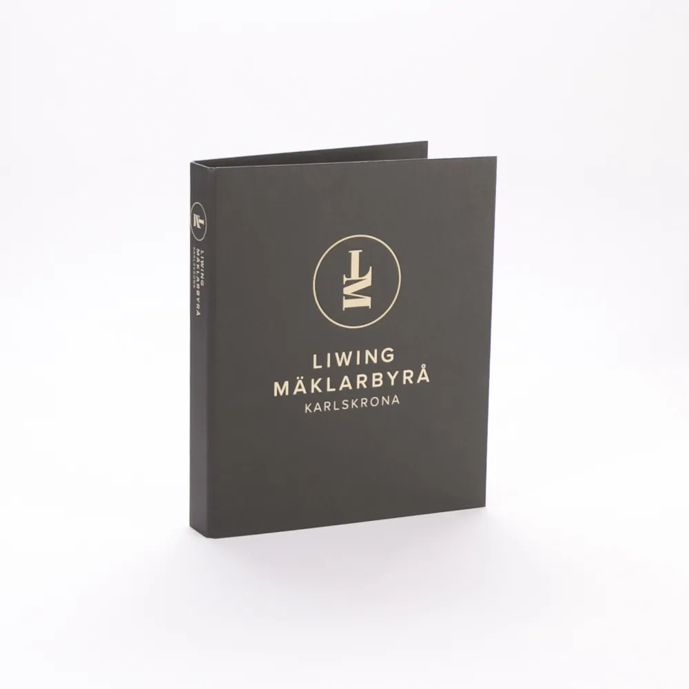 For the Karlskrona based real estate agency Liwing we have produced a contract binder covered in a coloured design paper. The logo and text are foil stamped on the front and back. We have also produced a cover page for the customer's own register tabs.