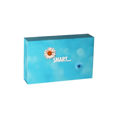 File box with laminated offset printed cover. Punched cellular plastic insert for jars, flap with concealed magnetic closure.