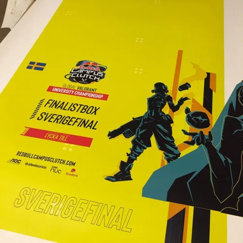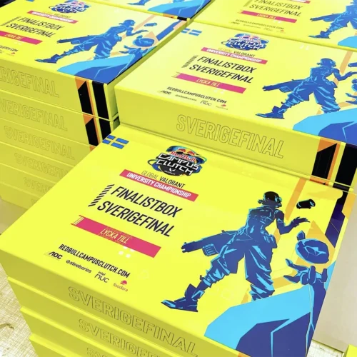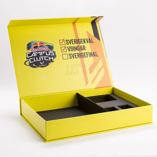 For the Red Bull - Campus Clutch event, we have produced a finalist box. In this box, the finalists receive a hoodie, a gaming mouse and two cans of Red Bull. The box is covered both inside and out with a matt laminated print sheet and has a combination interior of cardboard and cellular plastic. The box closes with hidden magnets in a locking flap.