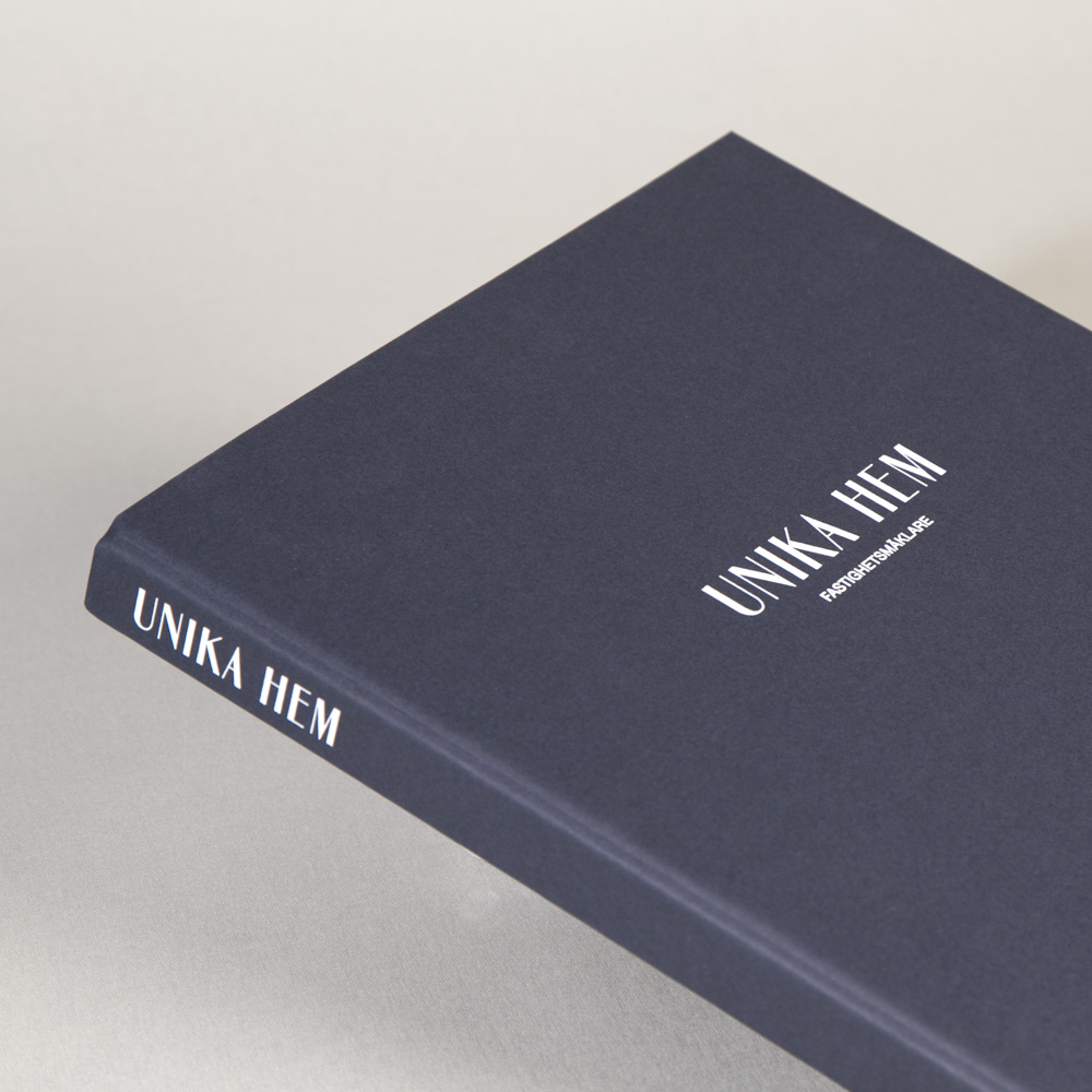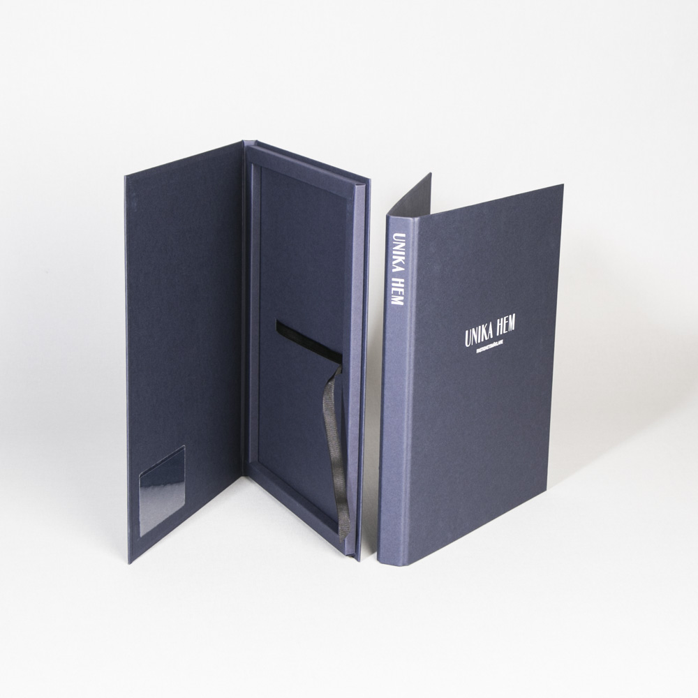 For the real estate agent Unika Hem, we have produced an estate agent binder and an estate agent box in matching design paper. The box is made of design cardboard in the same colour and an extra long lifting strap is mounted in the interior. The logo is foil stamped in white.