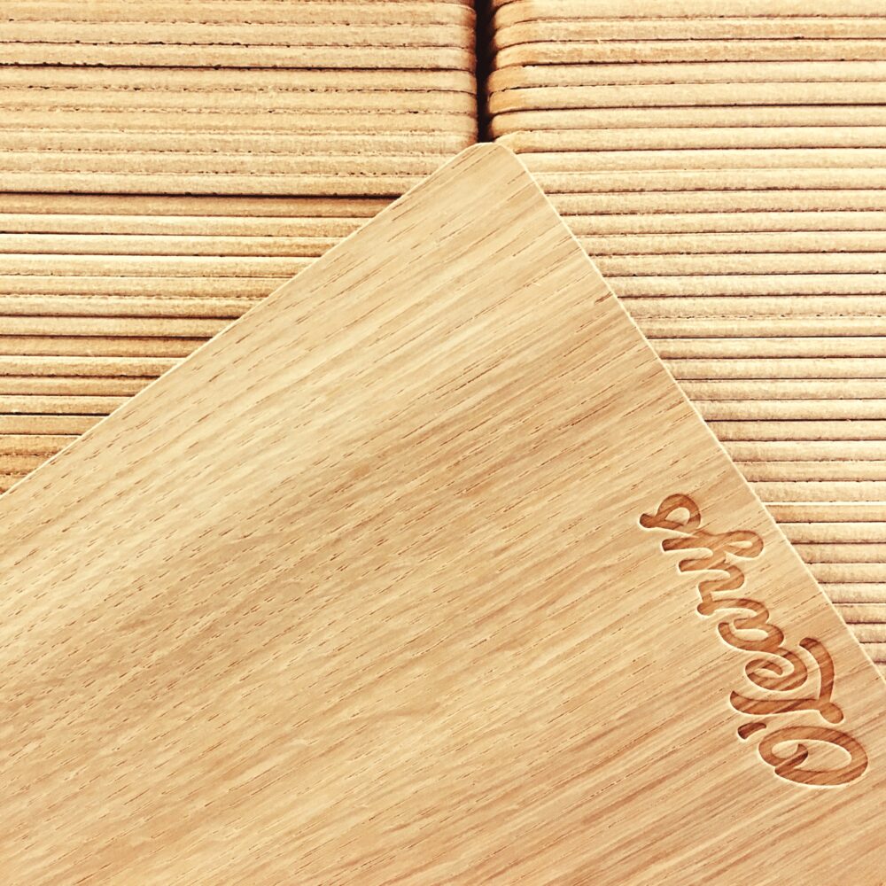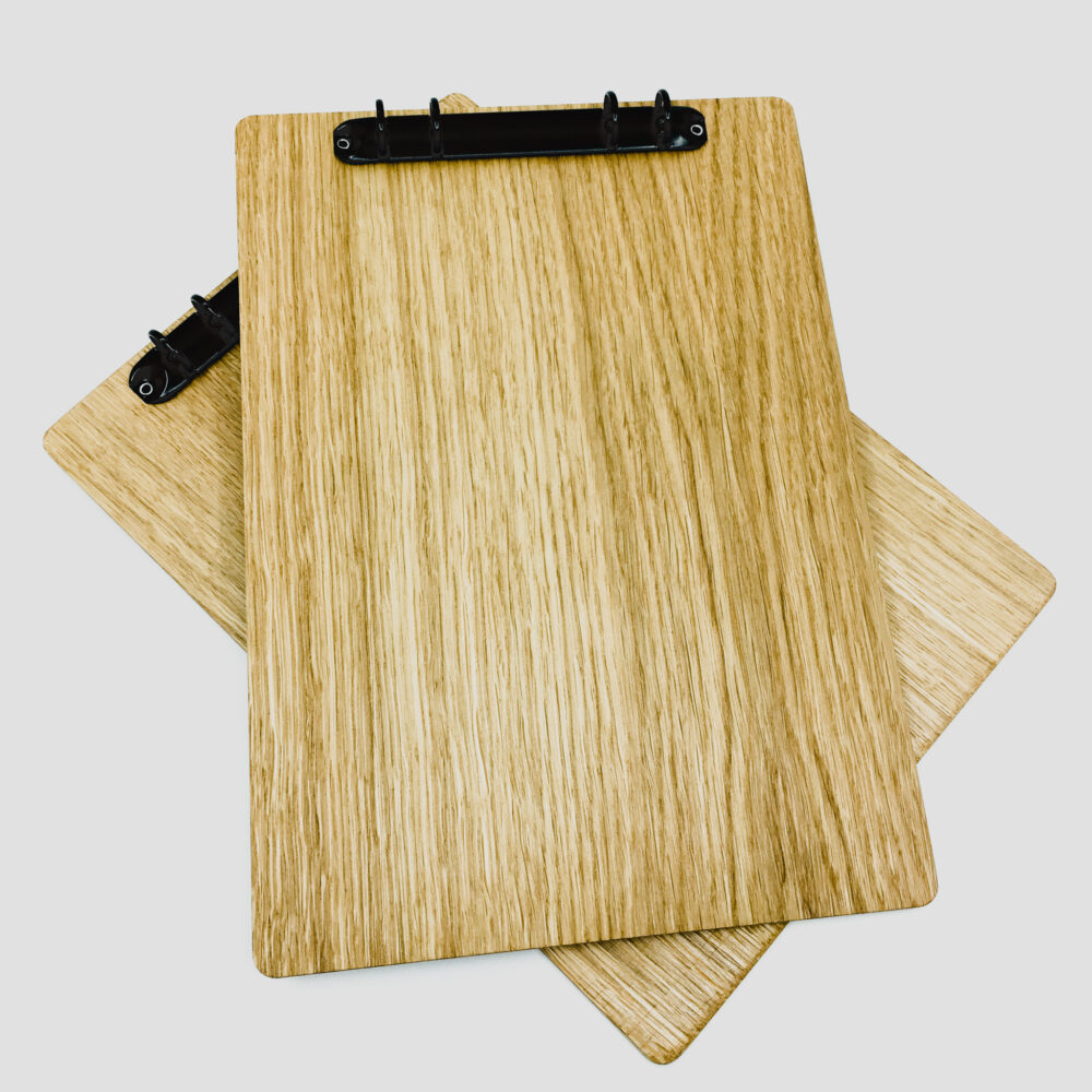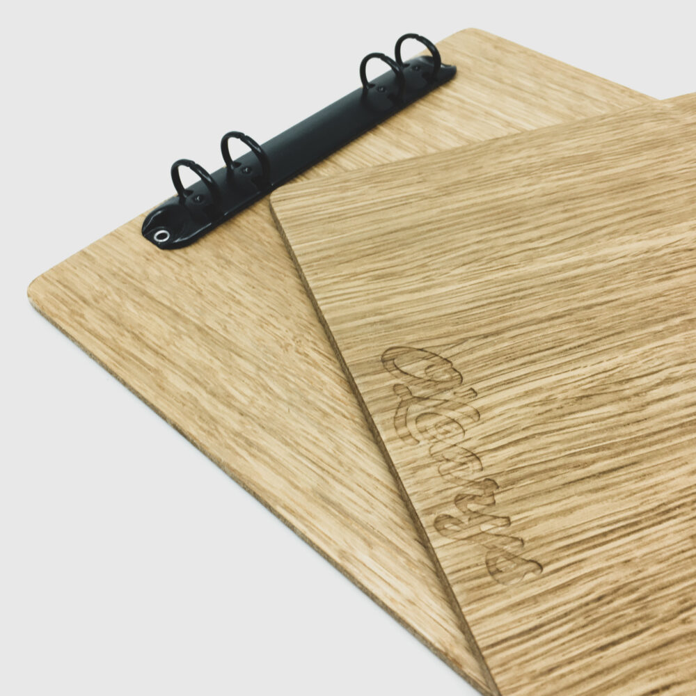 For the Oleary´s restaurant chain, we have manufactured a menu plate in oiled wood veneer. The menu leaves are attached to the plate with a black lacquered mechanism.
