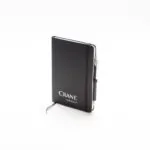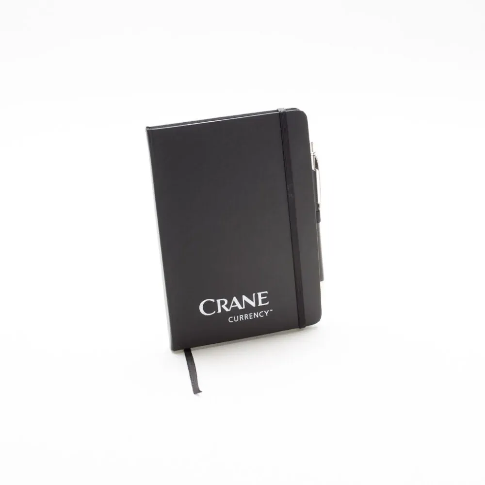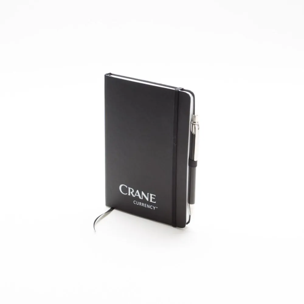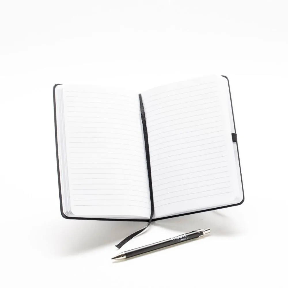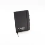 A5 notebook. Imitation leather notebook with ruled cover, ribbon marker, rounded corners, pen holder, cord lock. Foiled logo in white