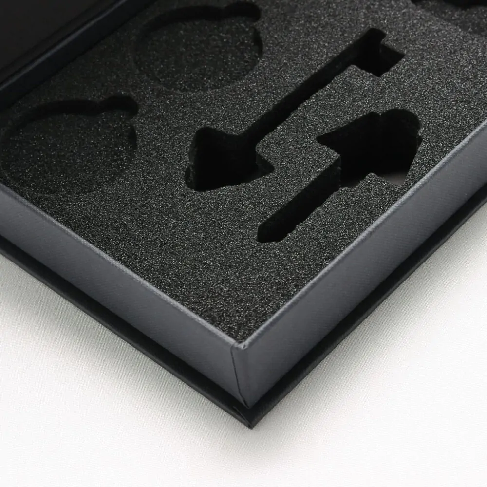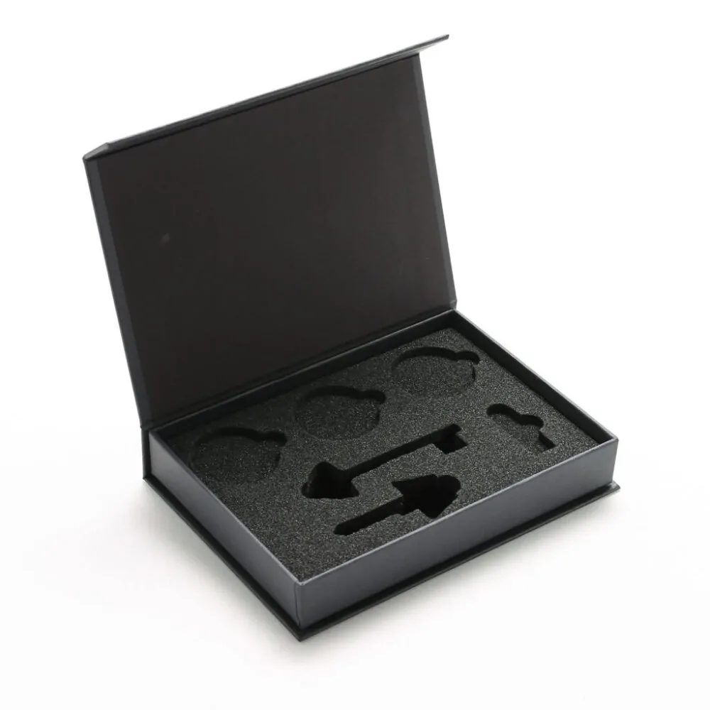 Klädd med strukturpapperFoliepräglad logo på locketDold magnetförslutning i klaffenAnpassat cellplast inrede