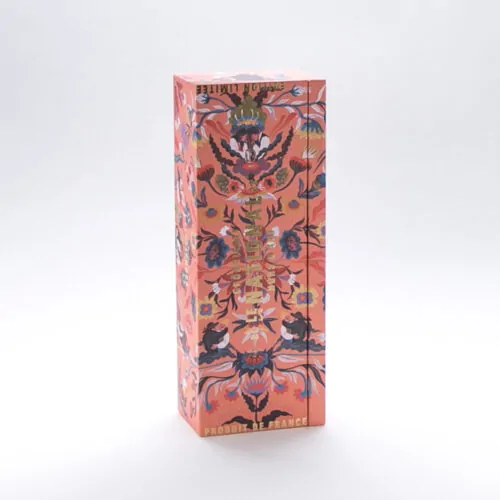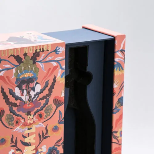 För Grönstedts Le National har vi tillverkat en special förpackning med en dragkonstruktion med dolda magneter. Ett klätt inrede form skuret efter flaskans former. Lådan är klädd med ett illustrerat motiv som inspirerats från traditionella motiv från Dalarna.