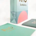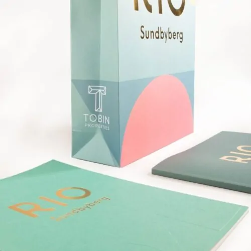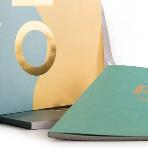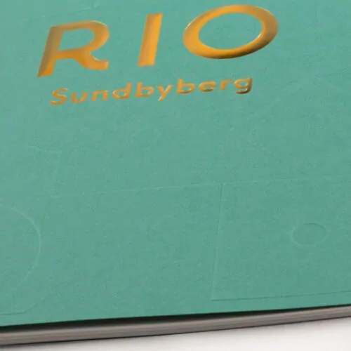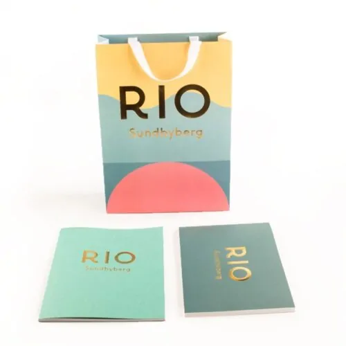 Kit bestående av tryckt bärkasse i obestruket papper med handtag i sidenband och folieprägling i guld på sidorna.Broschyrerna har färgtryckt inlaga med ett omslag som är blindpräglat och även det folierat i guld.