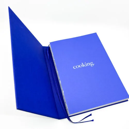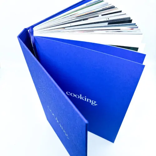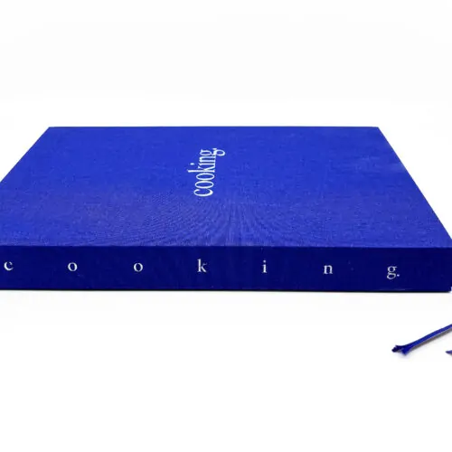 Vi har arbetat med flera projekt som krävt IKB. Det senaste var kokboken Cooking för vår kund Kristiana Ghiuri. Boken skulle spegla Kristianas recept – spännande, djärva och fulla av intensiva smaker. Vi valde en öppen s.k. schweizisk bindning, där bokens råa rygg och sömmar är synliga, pärmomslaget klätt med väv samt perfekt matchade detaljer. Kravet på lyxigt och felfritt hantverk var inget som skrämde vår produktion. Boken trycktes på det vackra svenska pappret Arctic Volume Ice och trådhäftningen var sedan en rutinuppgift. Den holografisk folieprägling på pärmomslaget och den manuella monteringen av bokblocken var en utmaning. Men den riktigt svåra delen? Att hitta de allra blåaste blå bland de olika materialen!