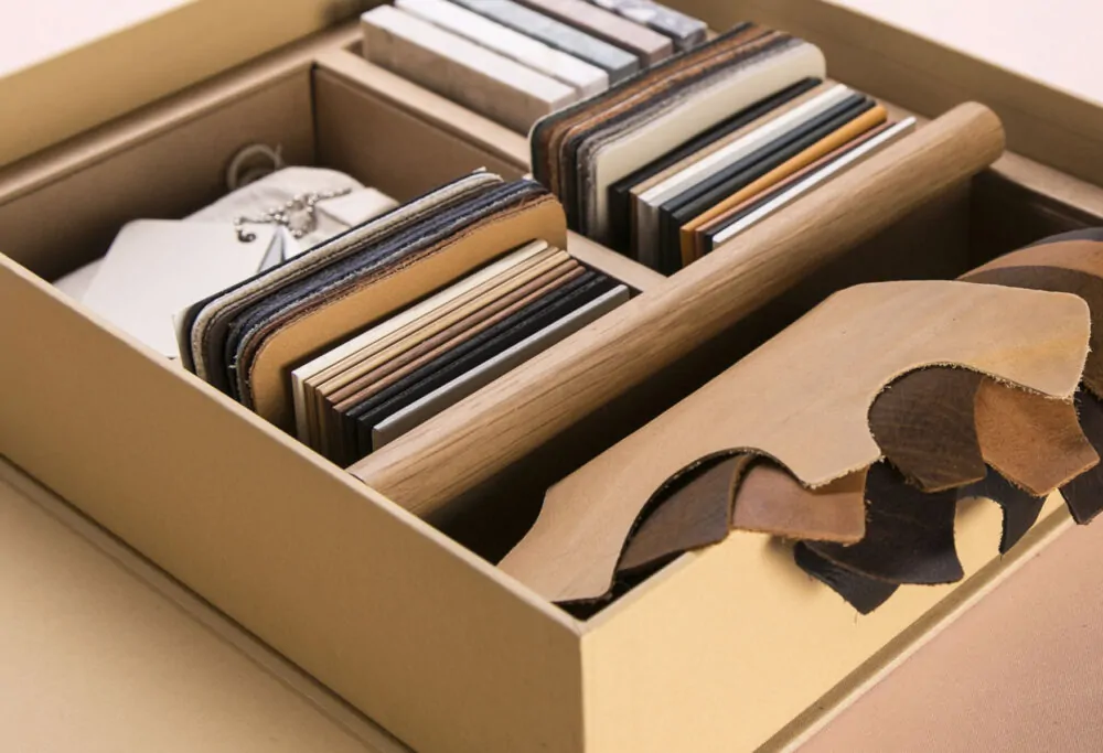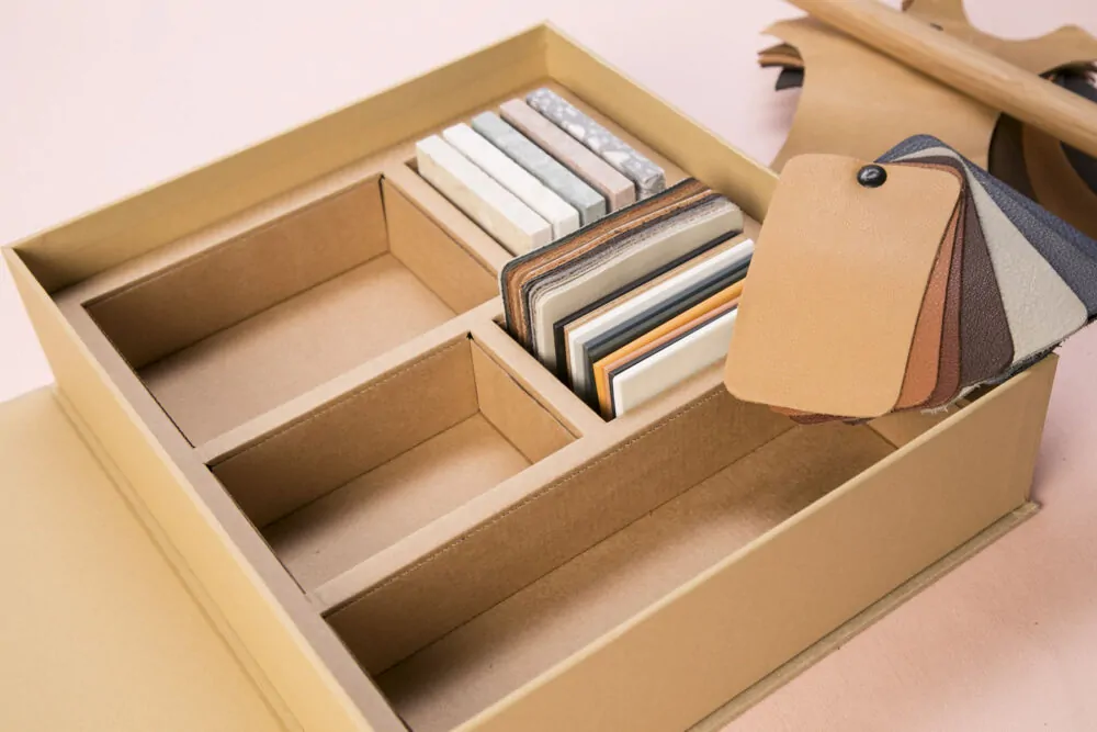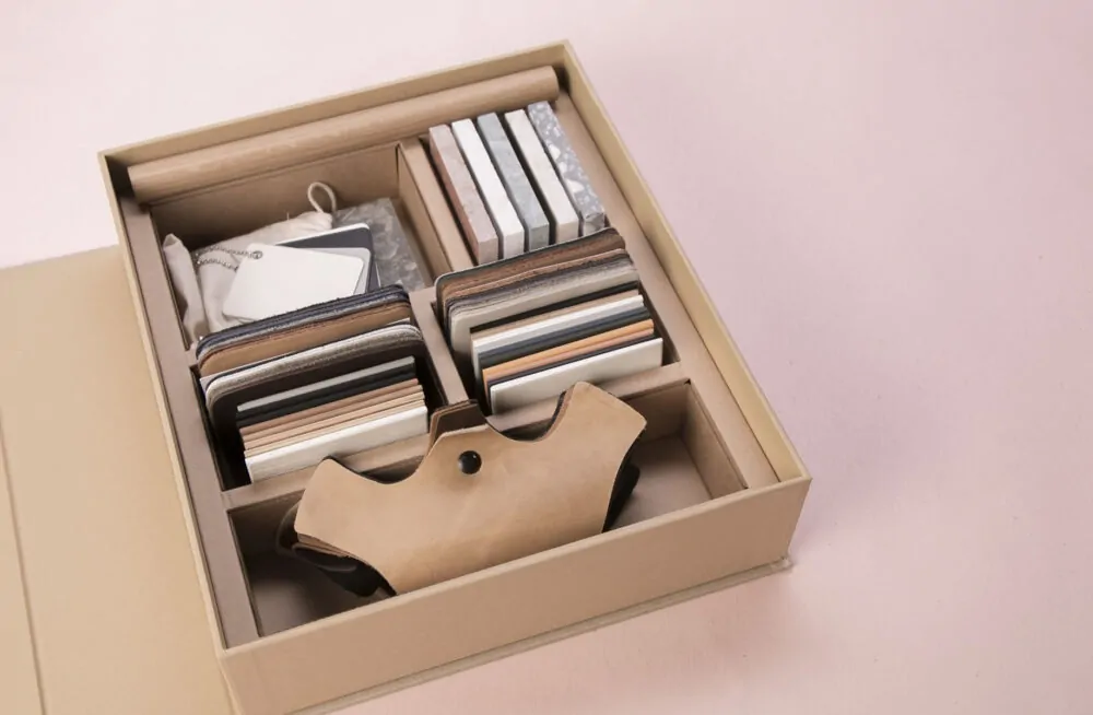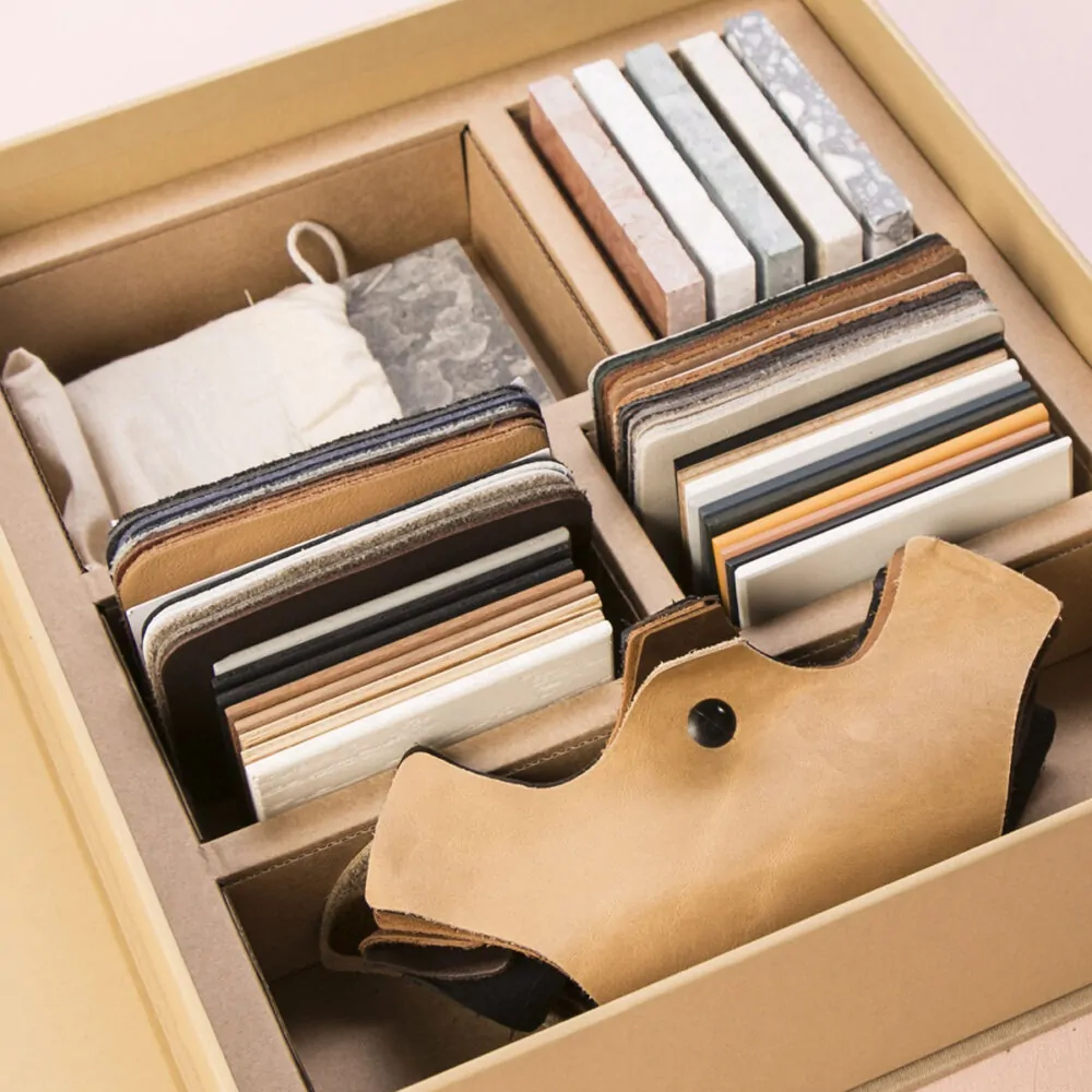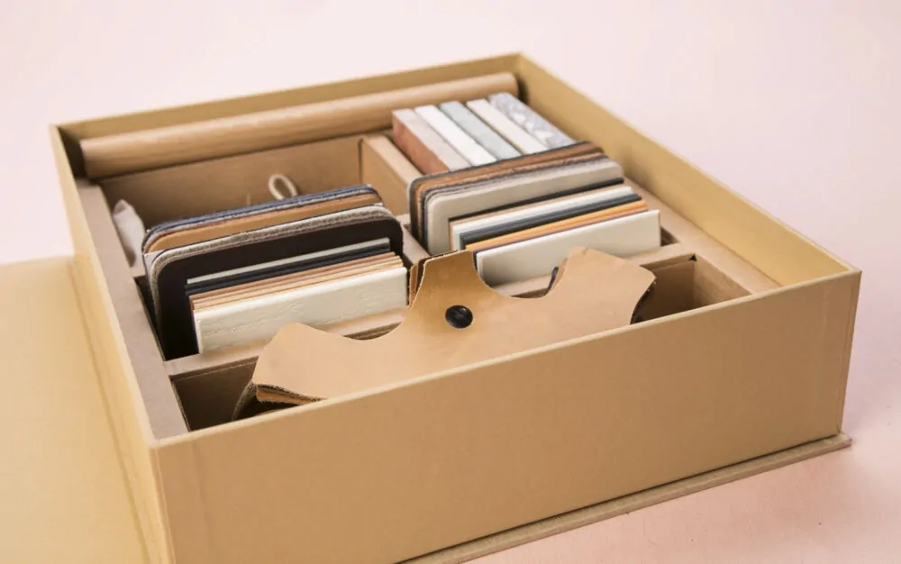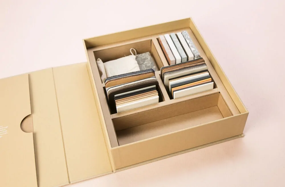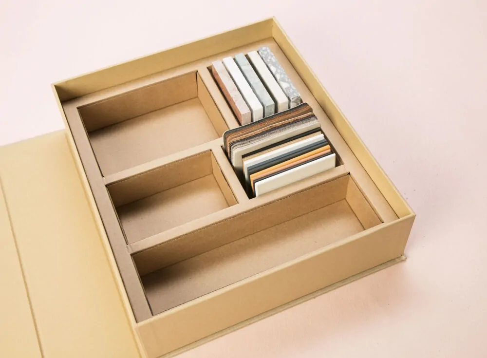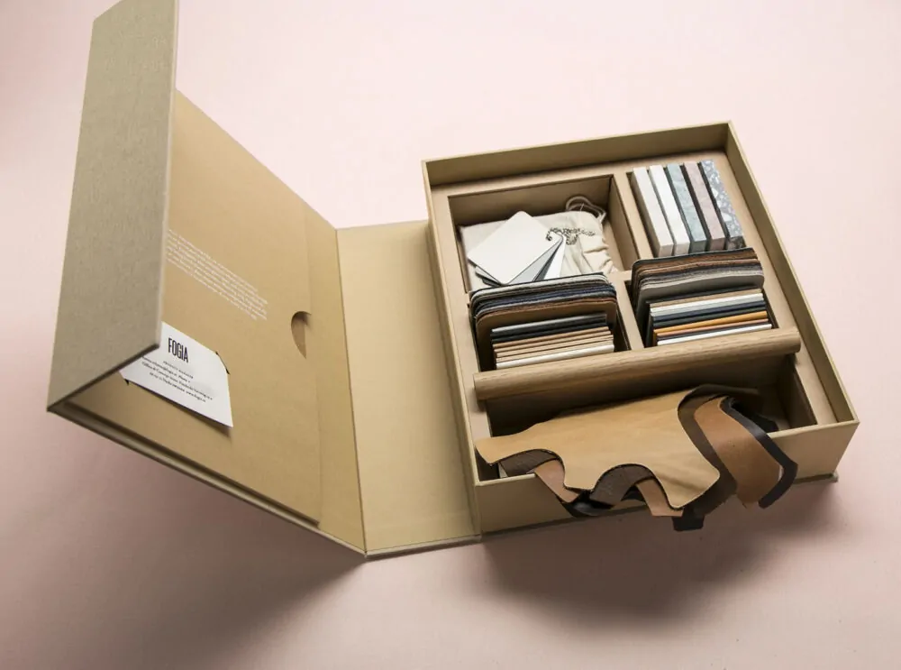 Vävklädd pärmlåda med kundspecifikt inrede för materialprover.Limmad ficka i locket.Lådan försluts med magnetlåsning.