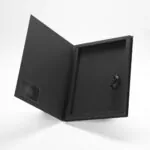 För den moderna fastighetsmäklaren Nokus har vi tagit fram en kontraktsbox med magnetförslutning och lyftband. Boxen är klädd med ett infärgat designpapper utvändigt och invändigt. Logotypen är foliepräglad med en blank svart folie.
