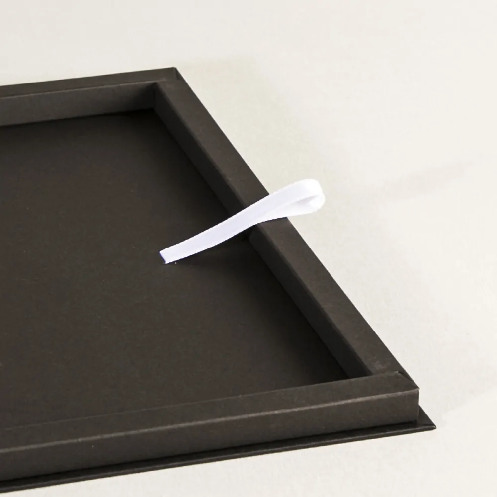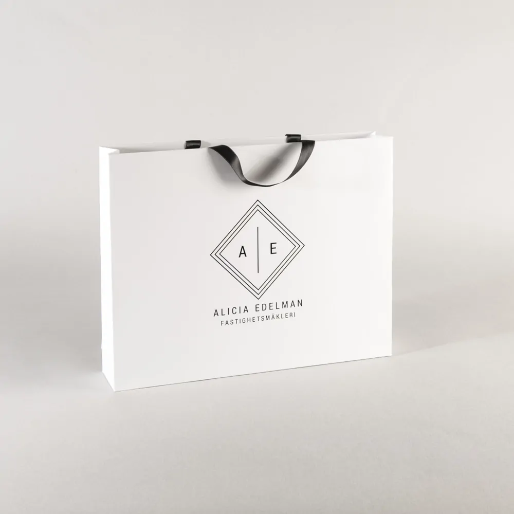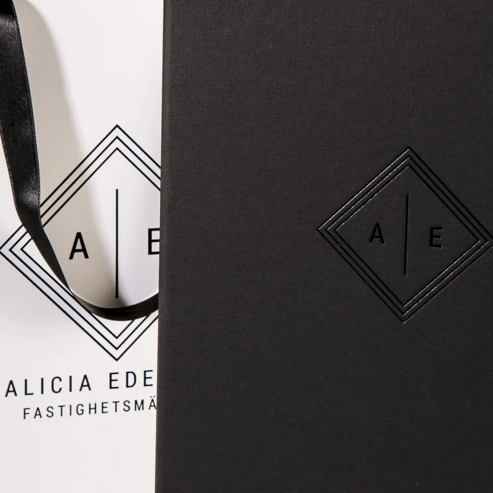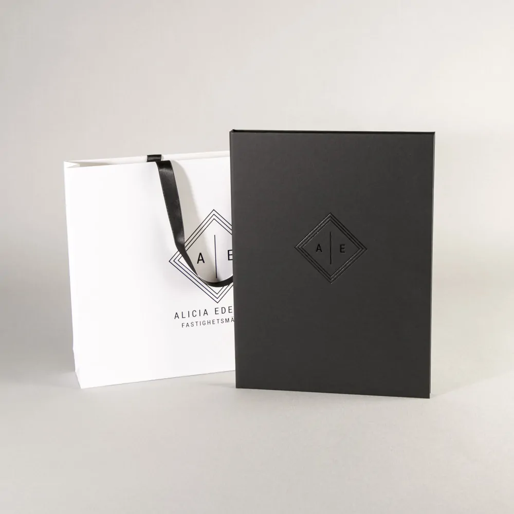 För fastighetsmäklaren Alicia Edelman har vi tillverkat en kontraktsbox för avtal och och dokument i svart strukturpapper med en foliepräglad logo i black svart folie. Boxen är tillverkad av svart designkartong med dolda magneter och lyftband. Till kontraktsboxen har vi även tillverkat en matchande bärkasse i vitt med svarta detaljer.