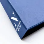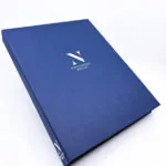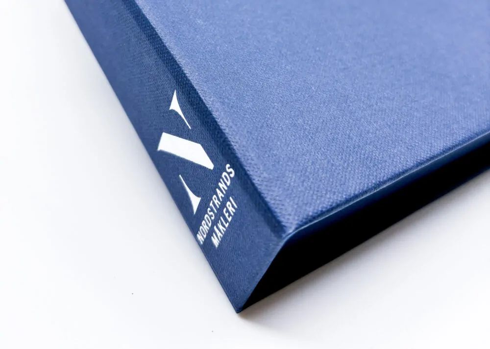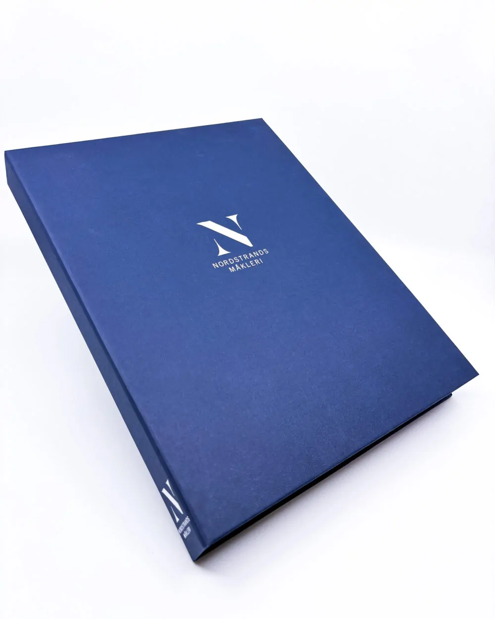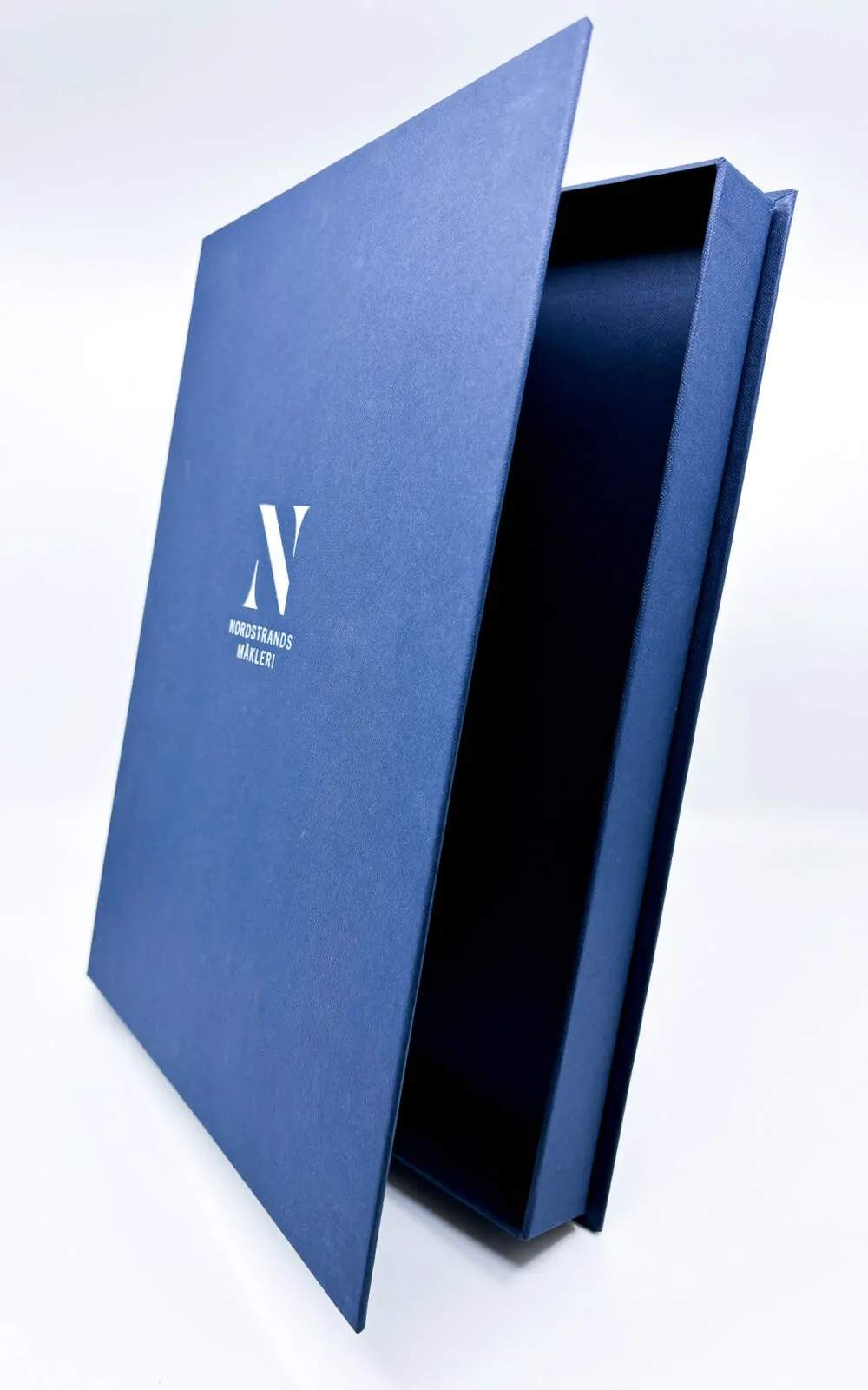 Fastighetsmäklaren Nordstrands ger en gåva till sina kunder i denna exklusiva box. Klädd i ett infärgat strukturpapper med folierad logo.