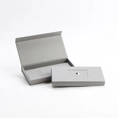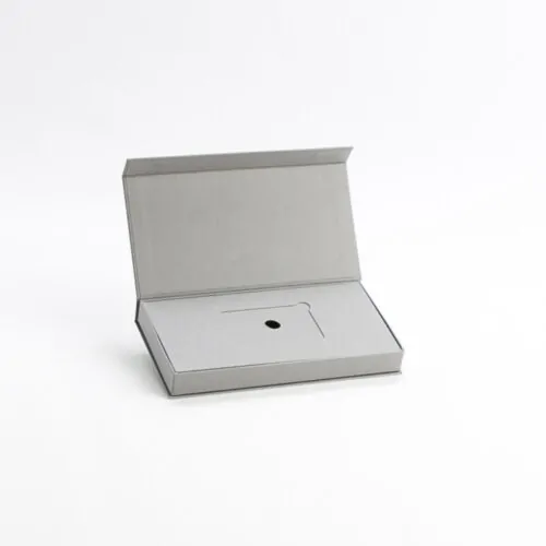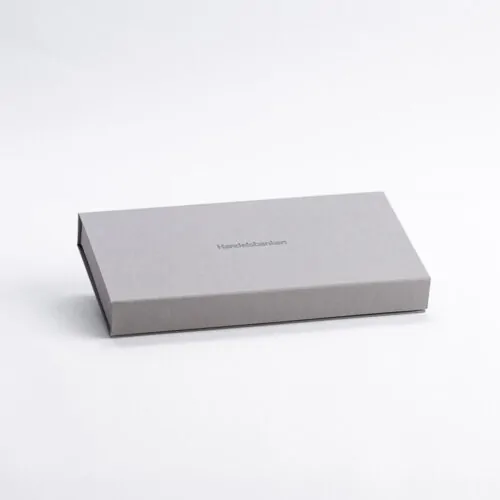 För Handelsbankens Platinum kort tillverkar vi en sobert box med magnet förslutning och inrede. Tillverkad helt i ett grått infärgat designpapper. Inredet går att lyfta ur för att därunder förvara tillhörande trycksaker. Logotypen är foliepräglad diskret på locket i en mörkgrå färg.