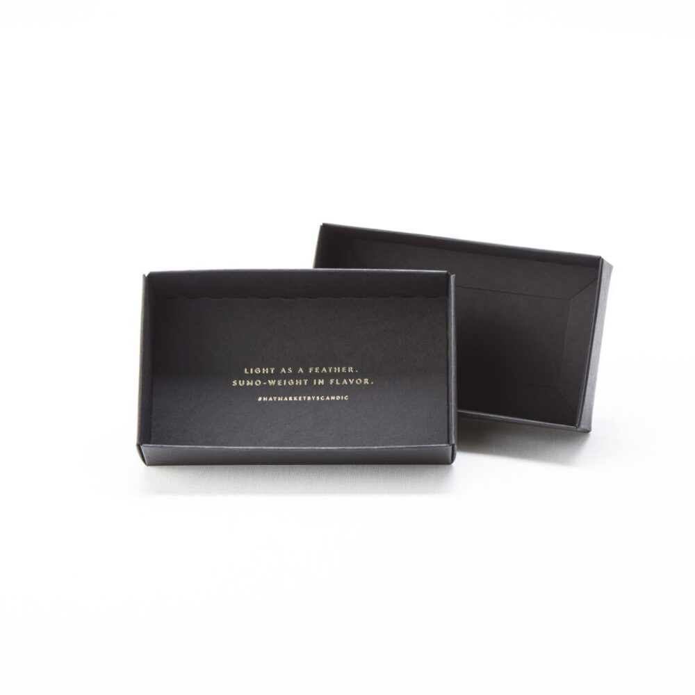 En enkel men exklusiv box för macarons i svart kartong med guldfolierad logo.